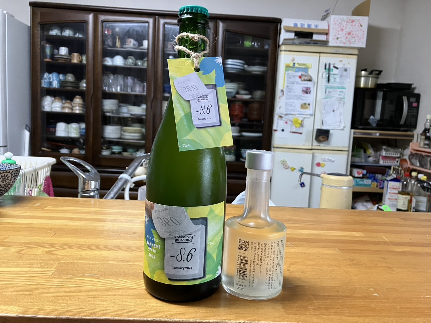 今回、自然栽培(無肥料・無農薬栽培)のデラウエアを使った「スパークリング白-8.6ワイン」と、同じく自然栽培の米から造られた日本酒が届きました。