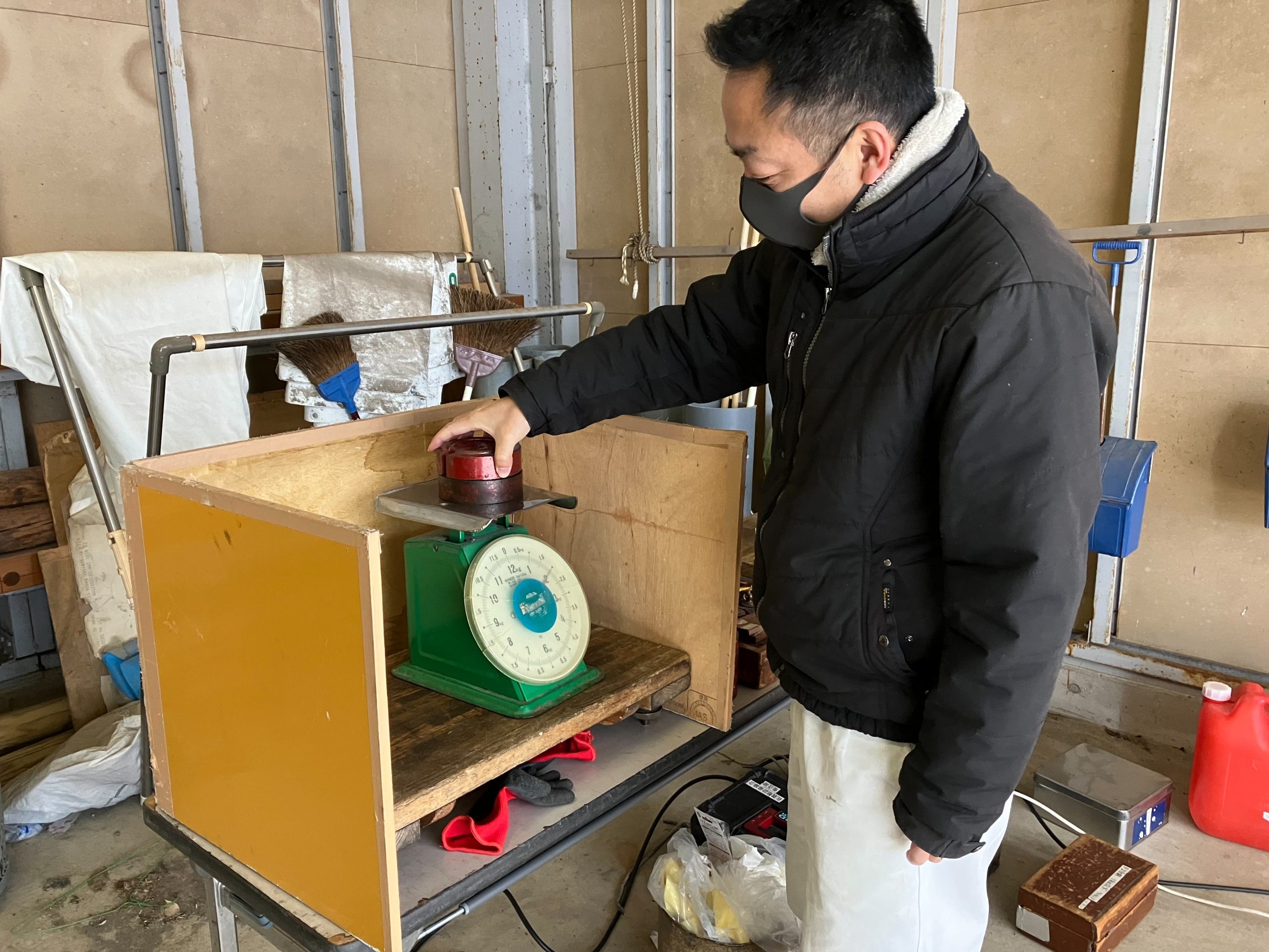 お米の重量を計る、ばね式の計り。